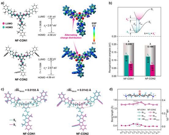与传统的稠环多环芳烃骨架不同,该研究团队设计了一种新型非稠环羰基/氮共轭二烯骨架,在电子缺陷的C=O基团和电子富集的N原子之间插入两个共轭C=C键。理论计算表明,这种非共轭骨架的能隙(1.97 eV)显著低于传统稠环骨架(4.06 eV),为实现红移发光奠定了基础。同时,C=ON原子的相反电子效应诱导了最高占据分子轨道(HOMO)和最低未占分子轨道(LUMO)沿二烯骨架实现原子级交替分布,保持了短程电荷转移特性,从而实现了窄谱带发光和热激活延迟荧光效应。研究团队合成了两种新型化合物NF-CON1NF-CON2,它们均包含一个C=O环己烷-1,3,5-三酮单元和三个N原子单元,通过共轭二烯骨架连接。其中NF-CON2引入了立体螺旋二芴基团,有效抑制了分子间聚集和发光猝灭。
