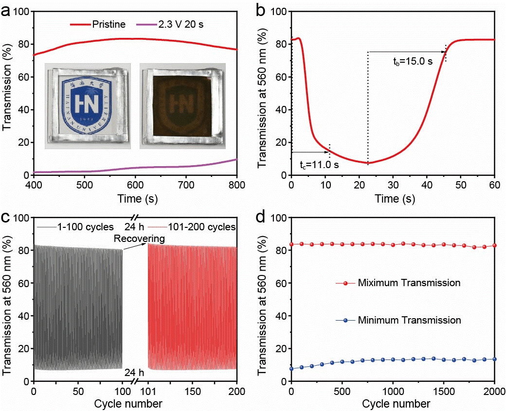 在大面积电致变色器件领域,实现均匀的电致变色调制一直是一个长期存在的挑战。9428cn太阳集团古天乐王振副教授及其研究团队提出了一种基于非金属碘单质可逆电沉积的电致变色动态窗技术,研发出基于离子液体 MPII3 活性材料的 Zn-MPII3 电致变色电池。相关成果以“Electrochromism via reversible electrodeposition of solid iodine”为题,发表在《Nature Communications》期刊以及“Ionic Liquid MPII3 Elevates Electrochromic Battery Capacity to Practical Applications”为题发表于《Advanced Materials》期刊上。研究采用含碘离子的盐包水电解液(29.5 m ZnCl2 + 0.5 m ZnI2),凭借其独特的电解液环境及其溶剂化结构,有效抑制了单质碘的溶解与穿梭效应,进而开辟了一条不同于传统电解液的反应路径。通过这一路径,成功实现了碘单质与溶剂化碘离子之间的可逆固-液相(I2/I-)转化,从而实现了稳定且可逆的碘电沉积与溶解过程。基于碘单质电沉积的电致变色器件表现出了高达76.0%的优异光学调制率,并能够实现接近色中性的着色状态。此外,器件还具备自愈功能,其褪色态的透过率可通过静置恢复至初始水平,有效延长器件的使用寿命。研究为电致变色电池领域发展开拓了新思路,彰显了离子液体在该领域的潜在应用价值,也为电致变色电池在可供电智能窗、节能建筑等领域的实际落地提供了重要参考。