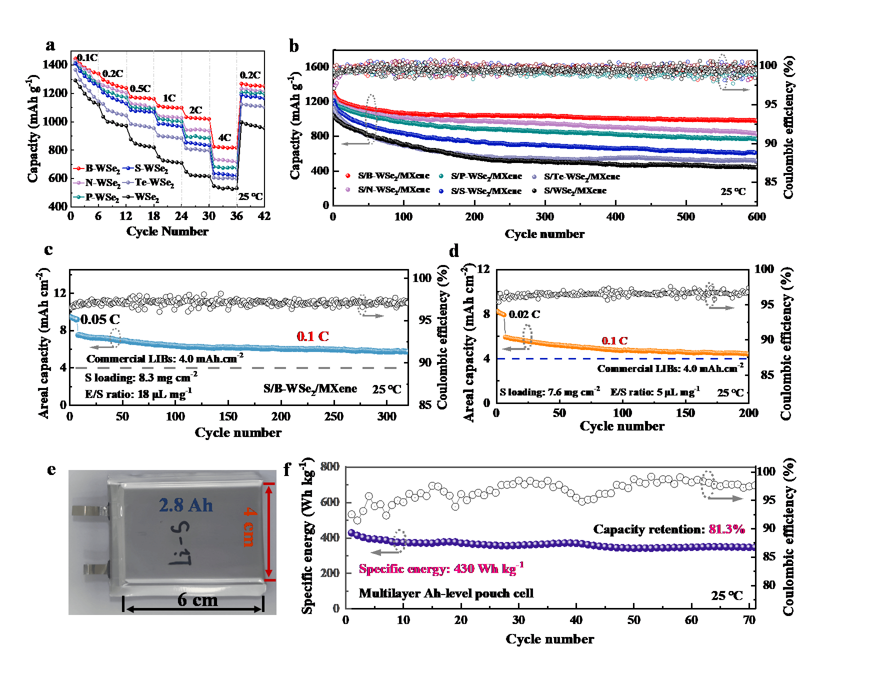 团队在锂硫电池关键催化机理研究领域取得重要突破,相关成果以 《Design rules for anion-doped catalysts revealed by p-p-s orbital coupling in Li-S chemistry》为题发表于国际顶级期刊《Nature Communications》。团队针对锂硫电池多硫化锂转化动力学缓慢、穿梭效应等核心问题,突破传统试错研发模式,结合机器学习、密度泛函理论计算与实验验证,首次从电子结构本质出发提出基于 p-p-s 轨道耦合的阴离子掺杂催化剂理性设计新准则,揭示了阴离子掺杂通过调控轨道电子耦合强度实现吸附与反应活性最优平衡的催化机理,还提出定量描述耦合强度的关键参数并建立相关映射关系验证了其普适性。基于该理论,团队成功构筑 B-WSe/MXene 高效催化材料,所制备的锂硫电池在高硫载量、贫电解液条件下表现出优异电化学性能,还实现了3Ah级安时软包锂硫电池的构筑,其能量密度超 430 Wh/kg,在器件尺度验证了设计准则的可行性与先进性。该成果为锂硫电池高效催化材料的理性设计提供了全新理论依据和技术路径,对推动高能量密度储能器件发展具有重要科学意义和应用价值,也为学校在海洋新能源材料和特种能源器件领域的持续创新奠定了坚实基础。