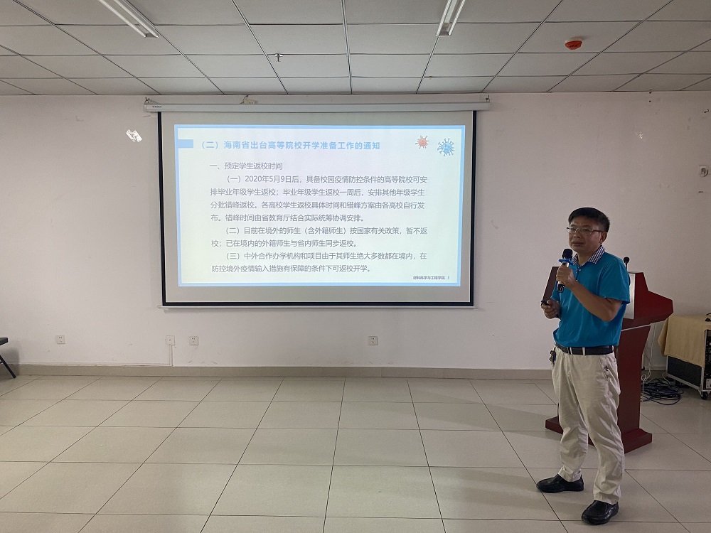 廖建和经理就学院办学理念、人才培养定位以及团队建设和大家在线分享。他指出,学院目前已经确定了以“天然橡胶材料、热带岛屿工程材料、海洋能源工程材料和生态环境材料”四个方向的团队建设主线,以专业认证为抓手,新工科人才培养为手段,“本硕博培养一体化”为支撑,对接海南十二大主导产业,面向全国、辐射东南亚, 努力建设成为我国热带、海洋高水平材料类专业人才培养和高水平材料科学研究基地,为国家南海战略服务和南海相关的海洋材料工程科学提供技术支持的办学目标。他强调,“一方有难、八方支援”磅礴的中国力量鼓舞着我们的每一个人!但与此同时,病毒根源及特效药仍悬而未决,说明科学研究还有很多未知领域,希望同学们依托学院的发展平台,抢抓海南自贸港建设的时机,专注科学研究并发奋学习,掌握过硬本领,赢得国家、社会和人生的大考。