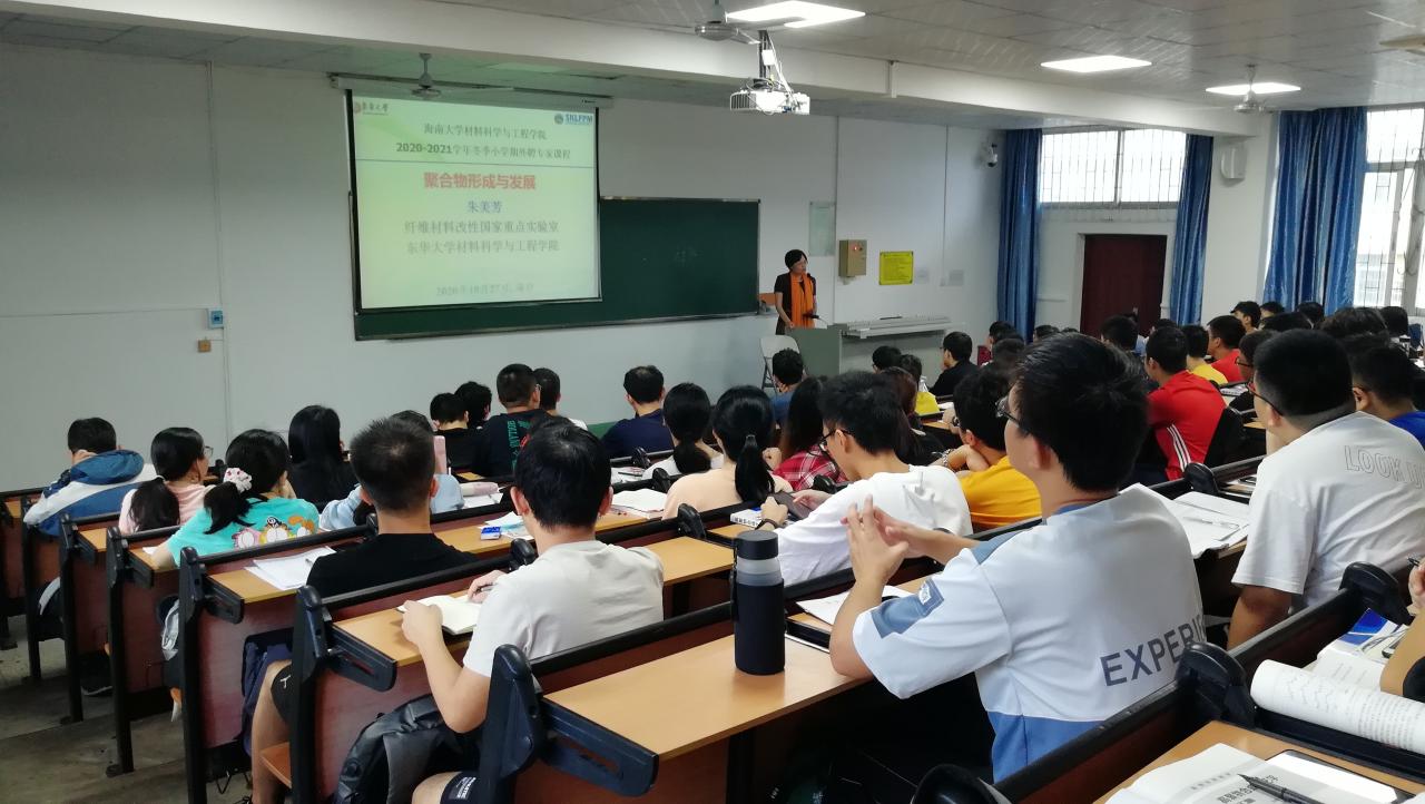 20201027日至28日,东华大学朱美芳院士应邀作为冬季小学期授课专家为高分子材料与工程专业本科生及研究生授课,授课主题分别为《聚合物合成原理及工艺学》、《聚合物基杂化纤维的功能耦合与传递机制》。