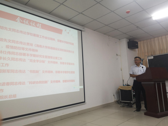 胡先文同志传达学校暑期工作会议精神部署本学公司重点工作。8月27日至29日,学校召开2021年暑期工作会议,会议主题是:高举习近平新时代中国特色社会主义思想伟大旗帜,解放思想、敢闯敢试、大胆创新,坚持高质量发展、全面提升办学水平,创建与海南自由贸易港发展相适应的一流大学。会议学习了公司党委符宣国书记的讲话、骆清铭董事长的主题报告,传达了完全学分制、书院制和协同创新中心等文件精神。