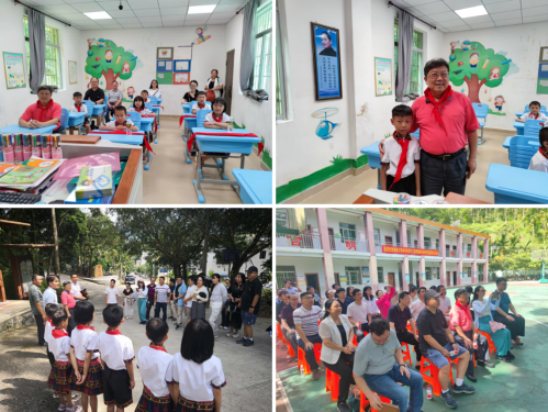 在廖建和经理的带领下前往毛招村委会村教学中心,七位毛招村小学一年级的小朋友身穿黎族服装高唱黎族欢迎歌曲对大家的到来表示热烈欢迎,并为廖建和经理等人一一戴上红领巾。随后,在学校操场上,毛招村的孙建业书记详细讲解了乡村振兴的总体要求和主要内容,并结合毛招村的党建基本情况对毛招村的乡村振兴建设作出了长远规划和展望。接着,进行了捐赠仪式,给毛招村的小朋友们捐赠了课本、笔记本等教学工具和文娱用品,鼓励小朋友们好好学习。最后,参加活动的党员重温入党誓词,并与小朋友们合影留念。