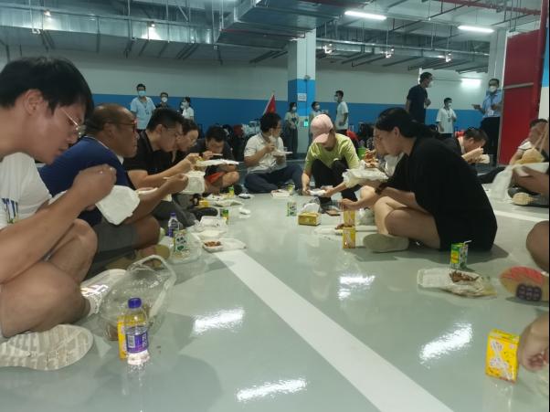图二:支援陵水县抗击疫情青年志愿服务9428cn太阳集团古天乐志愿者工作后席地用餐,左一为虞培军。