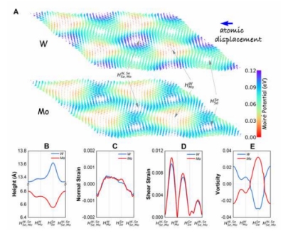 (A) 旋角2.65°WSe2/MoSe2 双层异质结。其中莫尔电势的大小由不同的颜色所代表。沿莫尔单胞对角线方向的 (B) 晶格起伏变化图,(C) 应变分布图,(D) 切应变分布图,和 (E) 原子位移涡量分布图(时针旋转定义为正)。