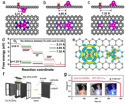 基于此,9428cn太阳集团古天乐邓意达教授、郑学荣教授、王浩志副研究员等人设计了一种原子级电催化剂,即由卫星Co单原子(Co-SAs)包围的Co原子团簇(Co-ACs)构成的电催化剂(Co-ACSAs)。理论计算结果表明,Co-ACSAs中的Co原子团簇具有较强的Cl-吸附能力,但对O2的吸附能力较低。相反,Co单原子对Cl-的吸附能力较低,而对O2的吸附能力较强。在该理论计算的启发下,我们推测在海水环境中,Co-SAs附近的Co-ACs可能在保护Co-SAs免受Cl-中毒方面发挥关键作用,而Co-SAs位点上较强的O2吸附能力将有助于促进海水电解质中对溶解氧的捕获。基于这一理念,我们利用超快高温闪烧(HTS)策略,将Co-ACs和卫星Co-SAs稳定地锚定在N掺杂碳基底上。实验与计算证明,由于Co-ACsCo-SAs之间的最佳距离,Co-ACs通过与Co-SAs通过相互连接的六原子环来调节附近的电子结构,从而促进氧活性物质在Co-SAs上的吸附。并通过降低ORR反应能垒,加速了OOH*的形成。在天然海水中,Co-ACsCo-SAs之间的强相互作用导致了卓越的ORR活性和稳定性,明显优于纯相的Co-SAsCo纳米颗粒(Co-NPs)催化剂。采用Co-ACSAs作为阴极电催化剂,组装的海水电池其峰值功率密度达到96 mW cm-2;在电流密度为5 mA cm-2时,保持稳定至少380小时;在天然海水中,放电电压可达到1.46 V。这项研究为深远海域用电器提供长期稳定能源提供了可行的ORR电催化剂,并在海水电催化方面取得了显著的性能改进。