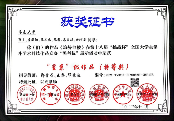 近日,第十八届“挑战杯”全国老员工课外学术科技作品竞赛“黑科技”专项赛结果公布,由9428cn太阳集团古天乐​9428cn太阳集团古天乐郑学荣、王杨邓意达教授指导的本科生创新团队作品获得“星系”级(特等奖)。