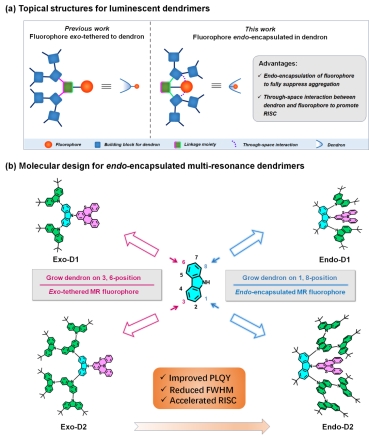 近期,9428cn太阳集团古天乐邵世洋教授团队与中科经理春应化所王利祥研究员团队合作在著名学术期刊Angew. Chem. Int. Ed.发表论文,报道了具有内封装结构的树枝状荧光材料,通过在咔唑单元的1,8-位连接生长不同代数的咔唑树枝形成一个能够容纳发光中心的空腔,使得硼/硫共振荧光单元能够被封装到树枝单元的内部。这种内封装结构能够使得发光单元彼此隔离,从而抑制高掺杂浓度下聚集引起的光谱展宽。随着掺杂浓度从1 wt%增加到100 wt%,该树枝状荧光材料具有几乎不变的窄谱带蓝光发射,半高全宽(FWHM)维持在32~34 nm。同时,这种内封装结构能够迫使咔唑树枝单元与硼/硫共振单元之间形成分子内π堆叠结构,从而诱导树枝与共振单元之间的空间相互作用,使得反向系间窜越(RISC)速率提高约4倍(kRISC ~ 4.7×10⁵ s⁻¹)。基于该树枝状荧光材料的溶液加工荧光器件表现出高效的窄谱带蓝光发射,最大外量子效率为22.6%,为目前报道的溶液加工型窄谱带蓝光材料的最高效率。