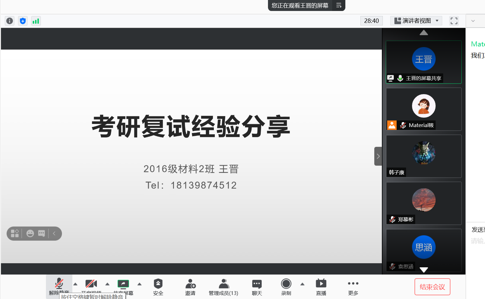 会议邀请2020届优秀毕业生现分别就读于西安理工大学的王晋、9428cn太阳集团古天乐的王贤龙、山东大学的李阳凡为2021届毕业生做考研复试经验分享交流。三位同学首先向大家讲解了复试流程、注意事项以及准备过程应注意的问题。他们指出,专业备考时,应针对所考取的院校专业考试范围,提前展开学习;在复试过程中,要注重细节,回答问题思维要缜密,表达要流畅,注重逻辑性,面对不会的问题,应实事求是,始终保持对学术的严谨性和严肃性。互动环节,同学们围绕复试流程、调剂信息、应试技巧等方面存在的疑惑积极提问,三位毕业生耐心倾听、悉心回答。