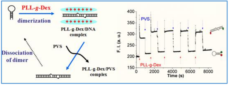 1利用 DNA 组装出纳米尺度下的分子机器,对我们认识 DNA 的构型转换规律、生物分子的相互作用与调控机制有着重要意义。DNA 分子机器运转的基础是 DNA 构型间的可控转换。我们合成出一种含有多糖支链的梳型阳离子共聚物 PLL-g-Dex,其可以促进 DNA 的链交换反应,并且提高 DNA 二级结构的稳定性。我们以 PLL-g-Dex 作为燃料驱动自补偿型 DNA 纳米机器实现快速、有效的运转。在此基础上,我们筛选出结合抗肿瘤活性功能蛋白的适配体作为目标DNA,通过适配体结构的转化实现功能蛋白的靶向释放,这就为 DNA 纳米机器在肿瘤检测与治疗方面的应用提供了可能。