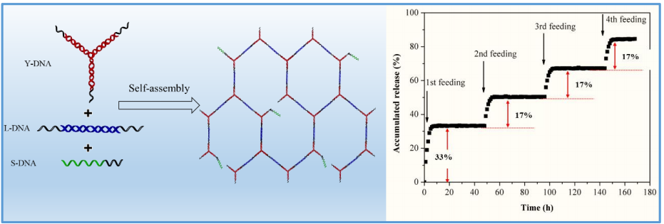 2核酸适配体功能化的 DNA 水凝胶可以作为蛋白质负载体系,利用其与核酸适配体互补的单链 DNA 实现功能蛋白的可控释放。我们构建了 DNA 结构单元,将其与单链 DNA 配体通过自组装制备出核酸适配体功能化的 DNA 水凝胶。凝胶过程可在生理条件下快速完成,并且能够快速、稳定的捕获特定的蛋白质分子。在互补单链 DNA 的作用下,核酸适配体与其杂交形成双链,从而使蛋白质分子从适配体中快速分离,并呈现出智能化的可控释放功能。