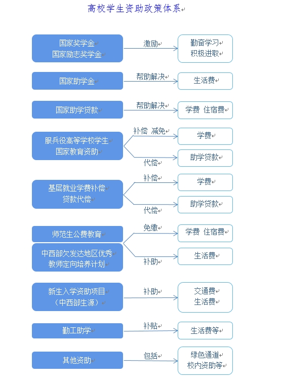 国家在高等教育本专科阶段建立起国家奖学金、国家励志奖学金、国家助学金、国家助学贷款等多种形式有机结合的高校员工资助政策体系。(如遇国家政策调整,以新政策文件为准执行)